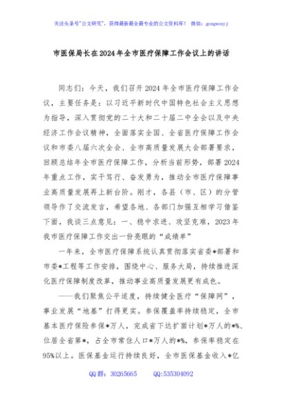 / 市医保局长在 2024 年全市医疗保障工作会议上的讲话