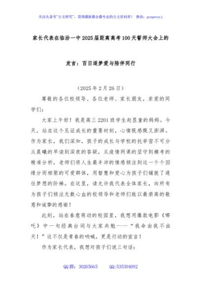 / 家长代表在临汾一中2025届距离高考100天誓师大会上的发言:百日逐梦爱与陪伴同行