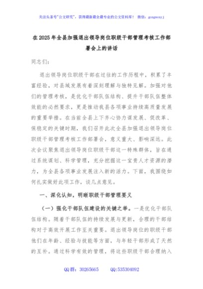 / 在2025年全县加强退出领导岗位职级干部管理考核工作部署会上的讲话