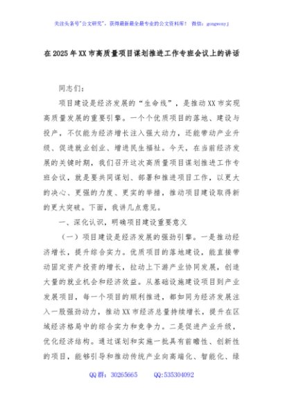 / 在2025年XX市高质量项目谋划推进工作专班会议上的讲话