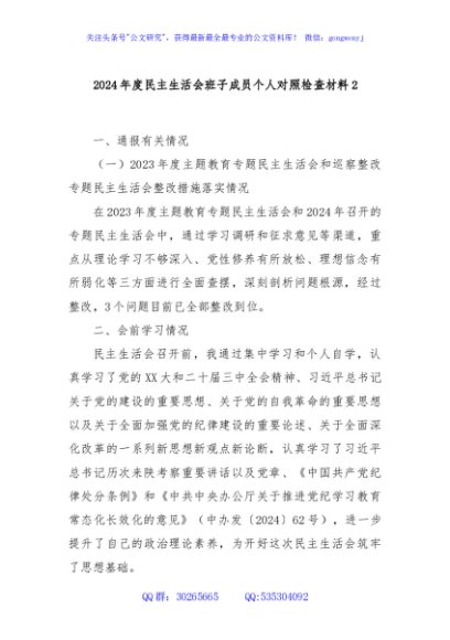 / 2024年度民主生活会班子成员个人对照检查材料2