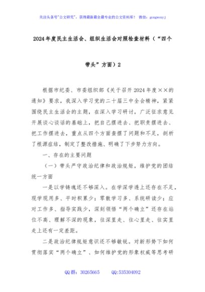 / 2024年度民主生活会、组织生活会对照检查材料(“四个带头”方面)2