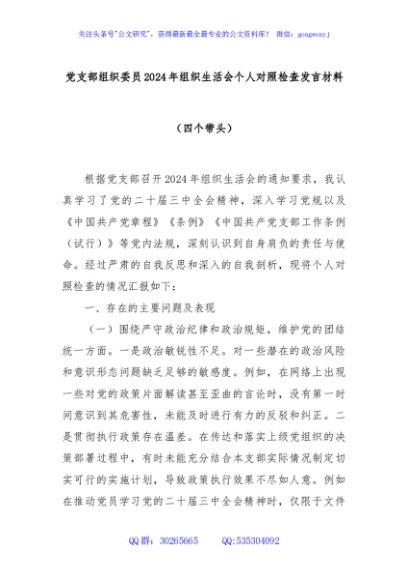 / 党支部组织委员2024年组织生活会个人对照检查发言材料(四个带头)