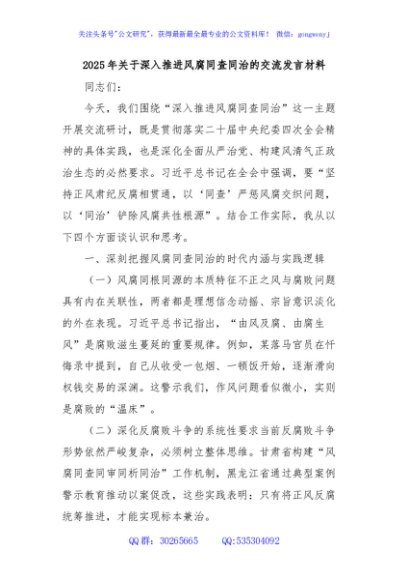 / 2025年关于深入推进风腐同查同治的交流发言材料