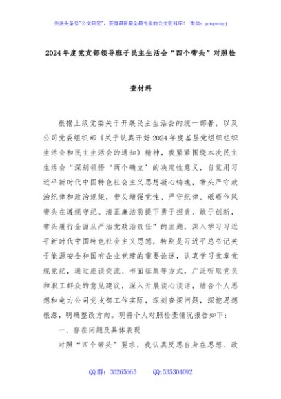 / 2024年度党支部领导班子民主生活会“四个带头”对照检查材料