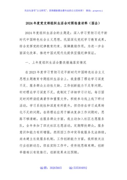 / 2024年度党支部组织生活会对照检查材料(国企)
