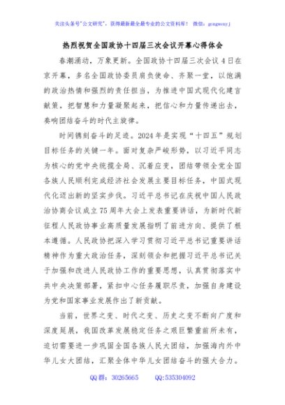 / 热烈祝贺全国政协十四届三次会议开幕心得体会