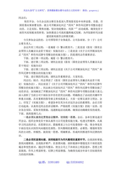 / 国企深化纠正“四风”和作风纪律专项整顿会议主持词