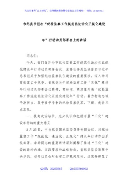 / 市纪委书记在“纪检监察工作规范化法治化正规化建设年”行动动员部署会上的讲话