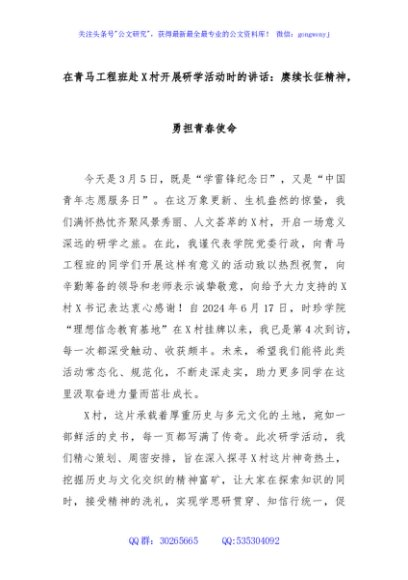 / 在青马工程班赴X村开展研学活动时的讲话:赓续长征精神,勇担青春使命