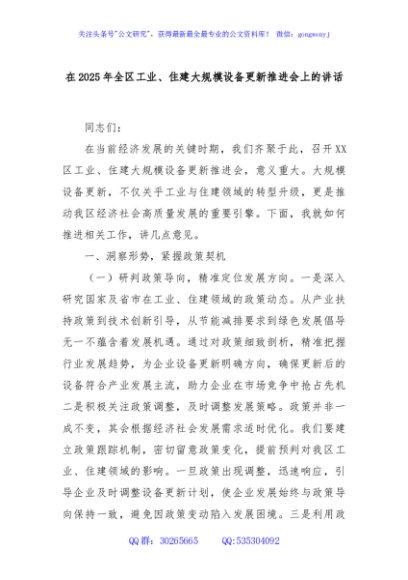 / 在2025年全区工业、住建大规模设备更新推进会上的讲话