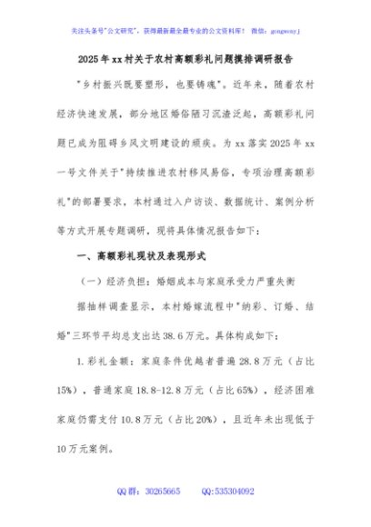 / 2025年xx村关于农村高额彩礼问题摸排调研报告(2)