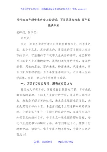 / 校长在九年级学生大会上的讲话:百日筑基向未来 百年富强唤尔来