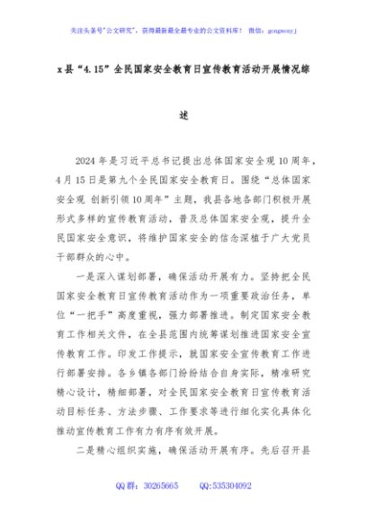 / x县“4.15”全民国家安全教育日宣传教育活动开展情况综述