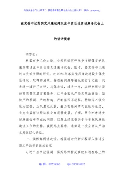 / 在党委书记落实党风廉政建设主体责任述责述廉评议会上的讲话提纲