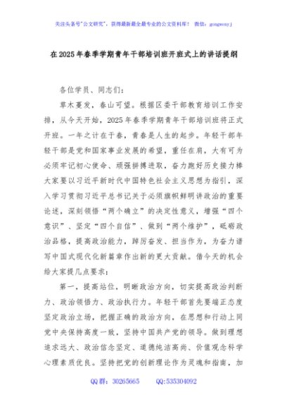 / 在2025年春季学期青年干部培训班开班式上的讲话提纲