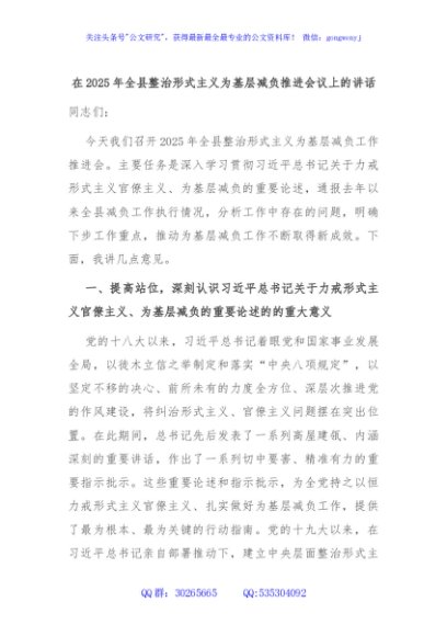 / 在2025年全县整治形式主义为基层减负推进会议上的讲话