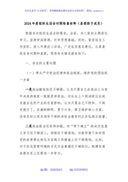 / 2024年度组织生活会对照检查材料(县委班子成员)