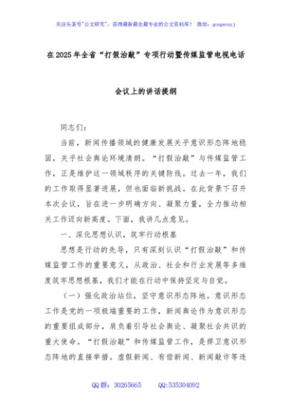 / 在2025年全省“打假治敲”专项行动暨传媒监管电视电话会议上的讲话提纲