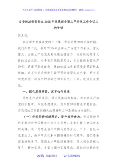 / 省委统战部部长在2025年统战部全面从严治党工作会议上的讲话