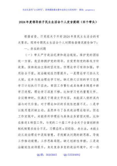 / 2024年度领导班子民主生活会个人发言提纲(四个带头)