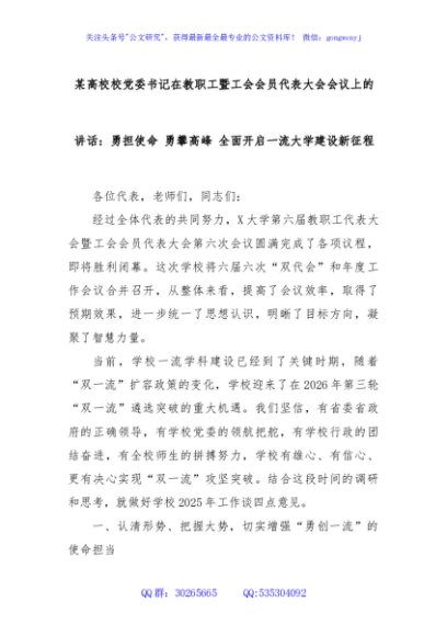 / 某高校校党委书记在教职工暨工会会员代表大会会议上的讲话:勇担使命 勇攀高峰 全面开启一流大学建设新征程
