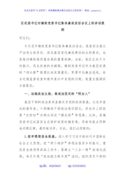 / 区纪委书记对镇街党委书记集体廉政谈话会议上的讲话提纲