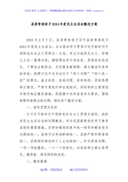 / 县委常委班子2024年度民主生活会整改方案