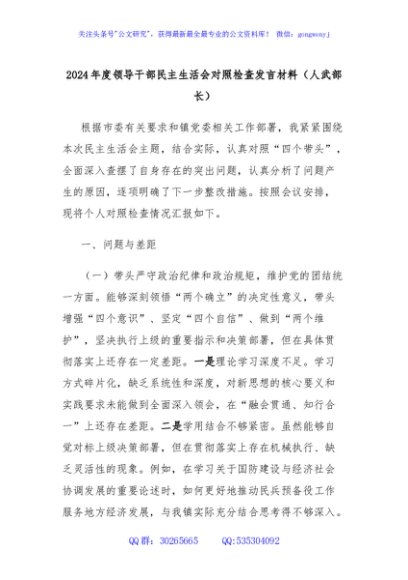 / 2024年度领导干部民主生活会对照检查发言材料(人武部长)