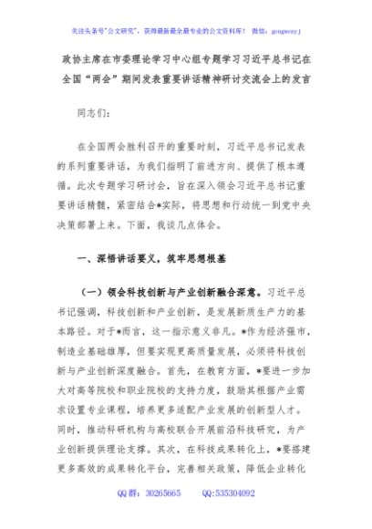 / 政协主席在市委理论学习中心组专题学习习近平总书记在全国“两会”期间发表重要讲话精神研讨交流会上的发言
