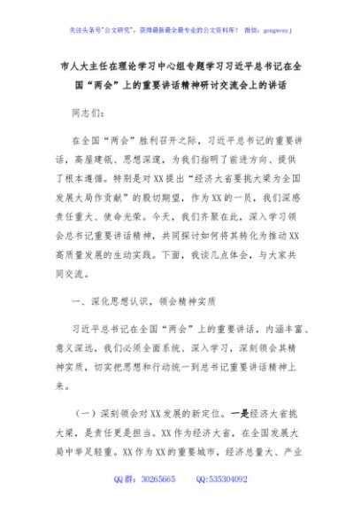 / 市人大主任在理论学习中心组专题学习习近平总书记在全国“两会”上的重要讲话精神研讨交流会上的讲话