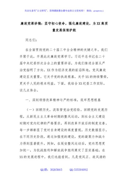 / 廉政党课讲稿:坚守初心使命,强化廉政建设,为XX高质量发展保驾护航