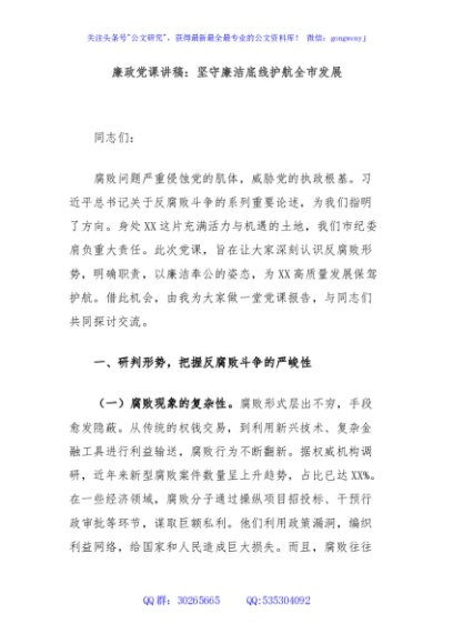 / 廉政党课讲稿:坚守廉洁底线护航全市发展