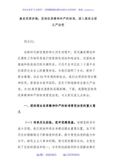 / 廉政党课讲稿:坚持改革精神和严的标准,深入推进全面从严治党