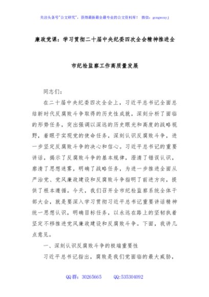 / 廉政党课:学习贯彻二十届中央纪委四次全会精神推进全市纪检监察工作高质量发展