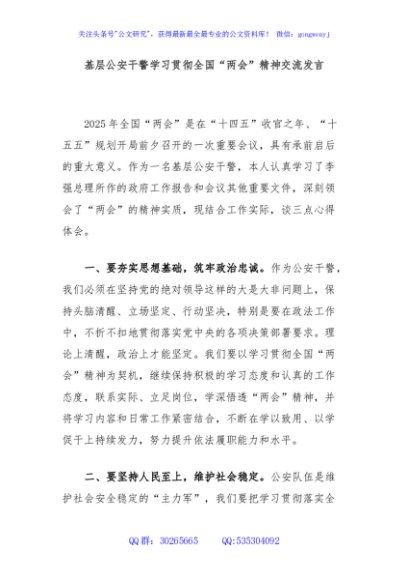 / 基层公安干警学习贯彻全国“两会”精神交流发言