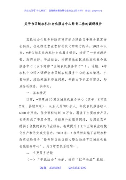/ 关于市区域农机社会化服务中心培育工作的调研报告