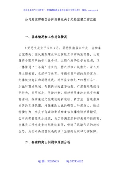 公司总支部委员会向巡察组关于纪检监察工作汇报
