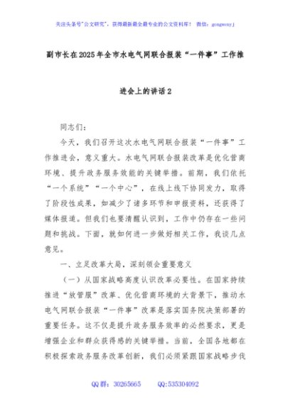 / 副市长在2025年全市水电气网联合报装“一件事”工作推进会上的讲话2