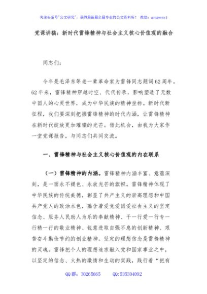 / 党课讲稿:新时代雷锋精神与社会主义核心价值观的融合