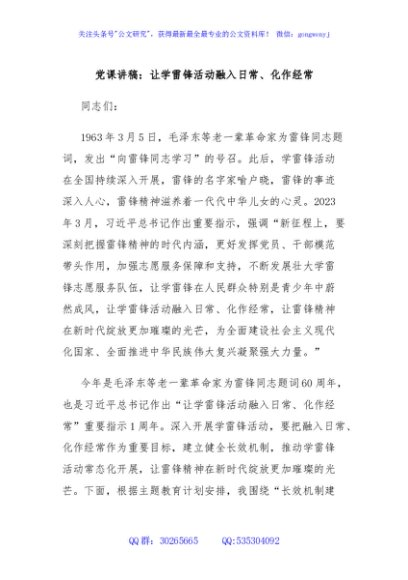 / 党课讲稿:让学雷锋活动融入日常、化作经常