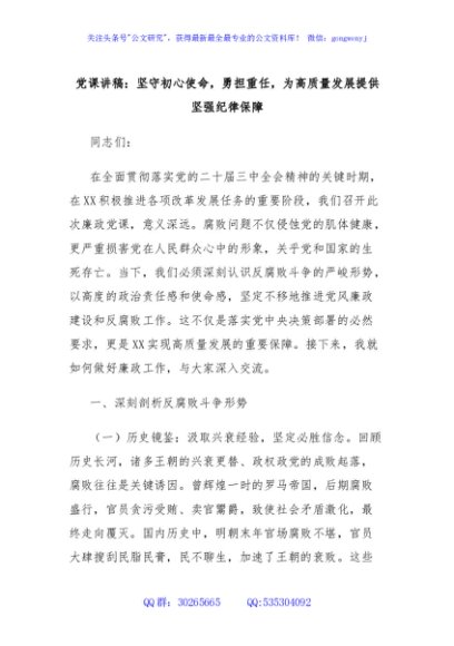/ 党课讲稿:坚守初心使命,勇担重任,为高质量发展提供坚强纪律保障