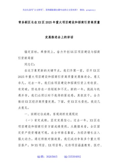 / 常务副区长在XX区2025年重大项目建设和招商引资高质量发展推进会上的讲话