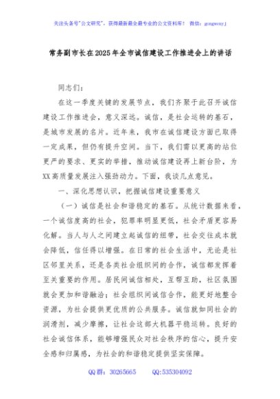 / 常务副市长在2025年全市诚信建设工作推进会上的讲话