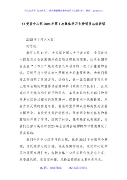 / XX党委中心组2024年第X次集体学习主持词及总结讲话
