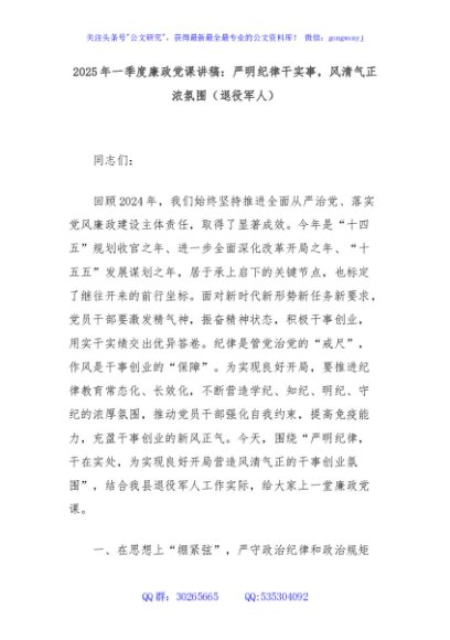 / 2025年一季度廉政党课讲稿:严明纪律干实事,风清气正浓氛围(退役军人)