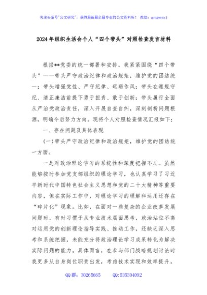/ 2024年组织生活会个人“四个带头”对照检查发言材料