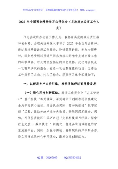 2025 年全国两会精神学习心得体会(县政府办公室工作人员)