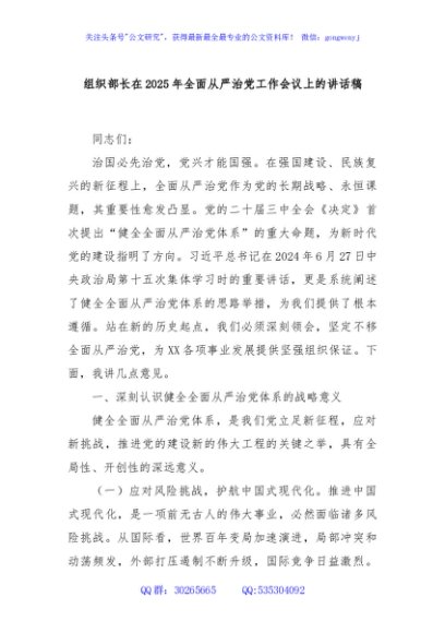 / 组织部长在2025年全面从严治党工作会议上的讲话稿