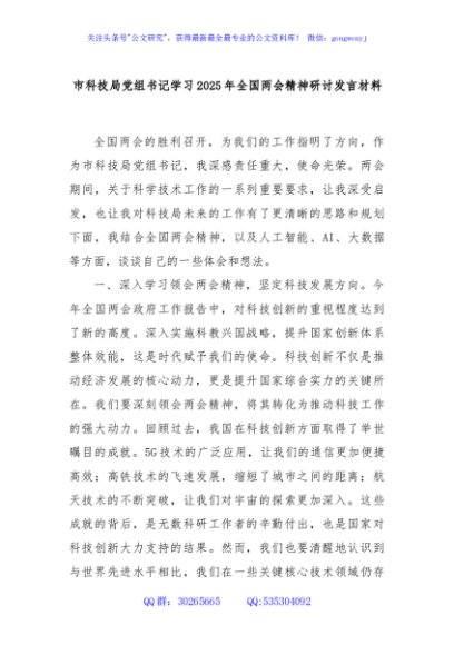 / 市科技局党组书记学习2025年全国两会精神研讨发言材料